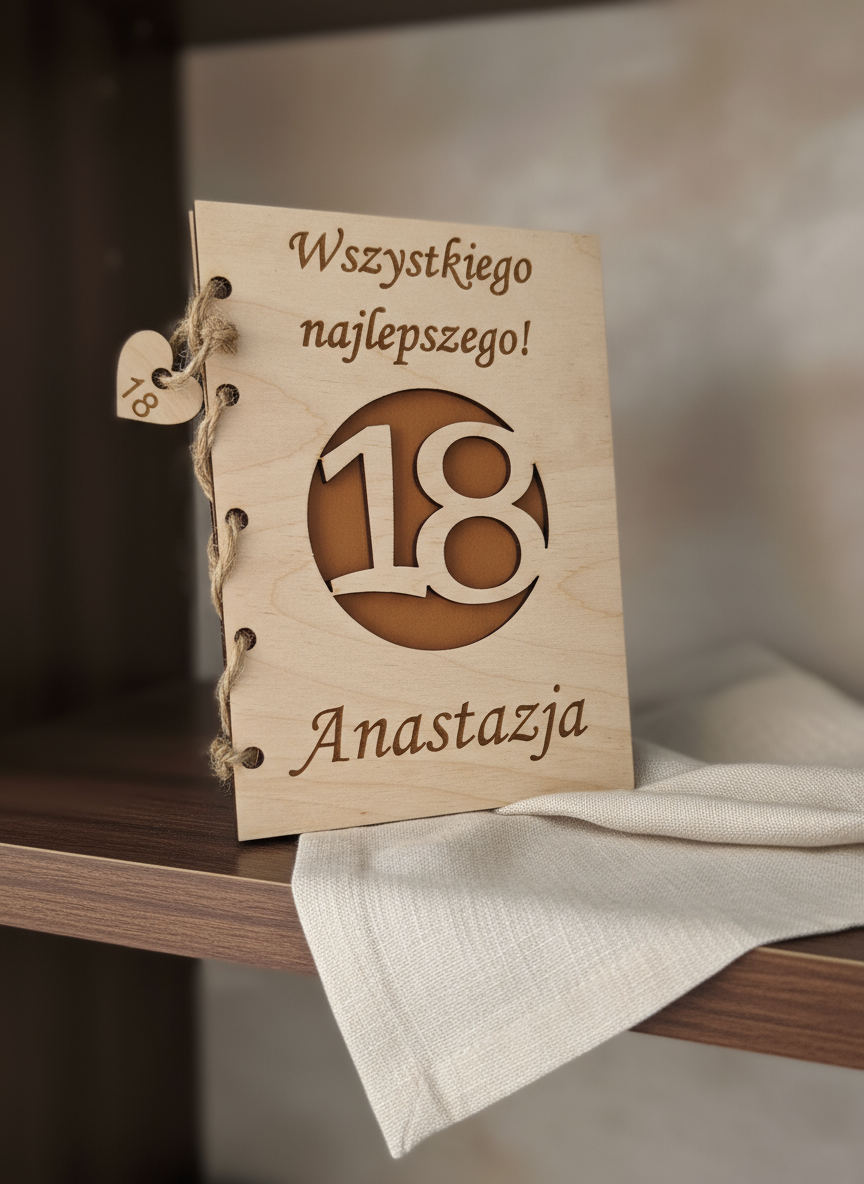 Podaruj coś więcej niż zwykłą kartkę! Nasza drewniana kartka grawerowana na 18 urodziny to unikalny i elegancki prezent, który zachwyci solenizanta i pozostanie pamiątką na lata.