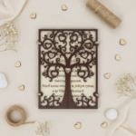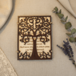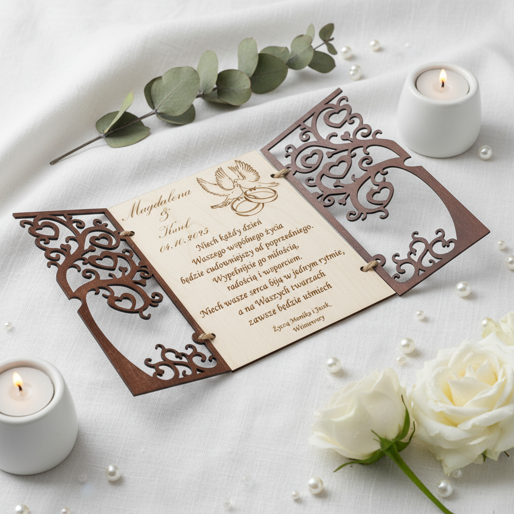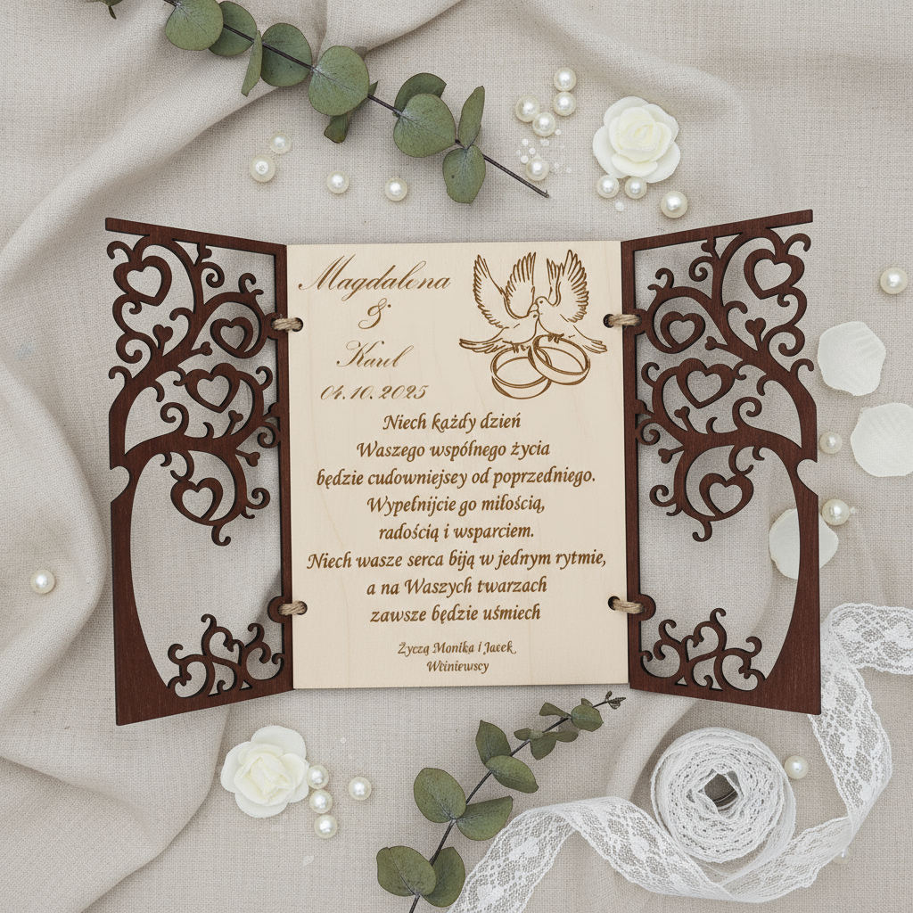 Ta wyjątkowa kartka ślubna wykonana jest z naturalnego drewna, a jej przód zdobi ażurowe drzewo, które rozkłada się jak brama – odkrywając grawerowane życzenia oraz delikatne motywy gołębic z obrączkami, symbolizujących miłość i wierność.