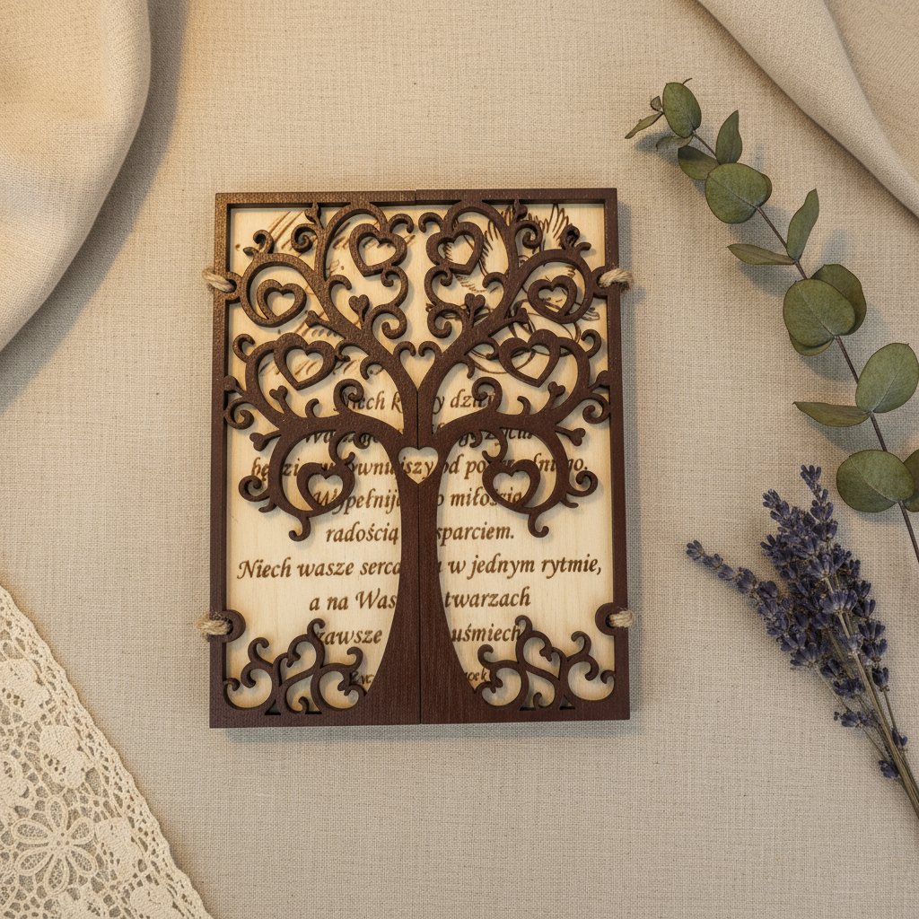 ✅ Trwała pamiątka – w odróżnieniu od papierowych kartek, ta z drewna pozostanie z Młodą Parą na zawsze.