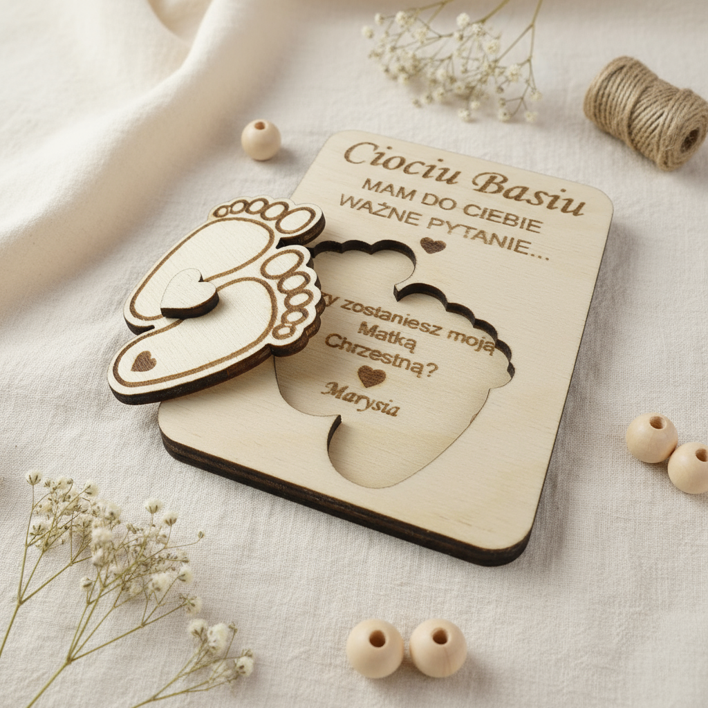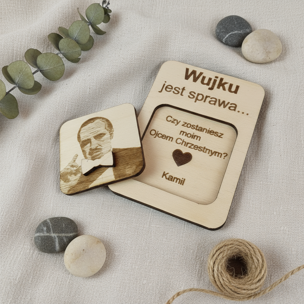 PYTANIE PROSBA DO CHRZESNTCH OJCIEC CHRZESTNY DREWNIANA KARTKA GRAWER