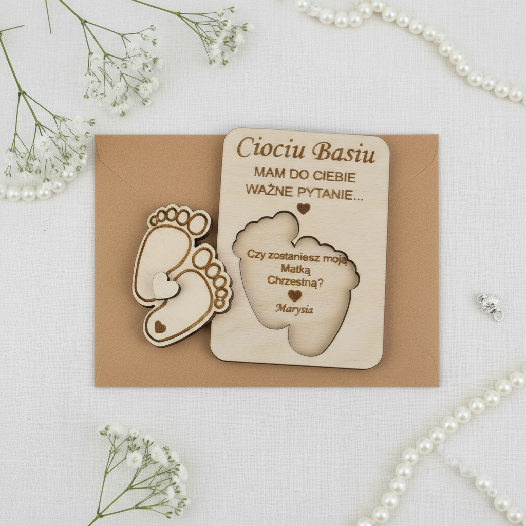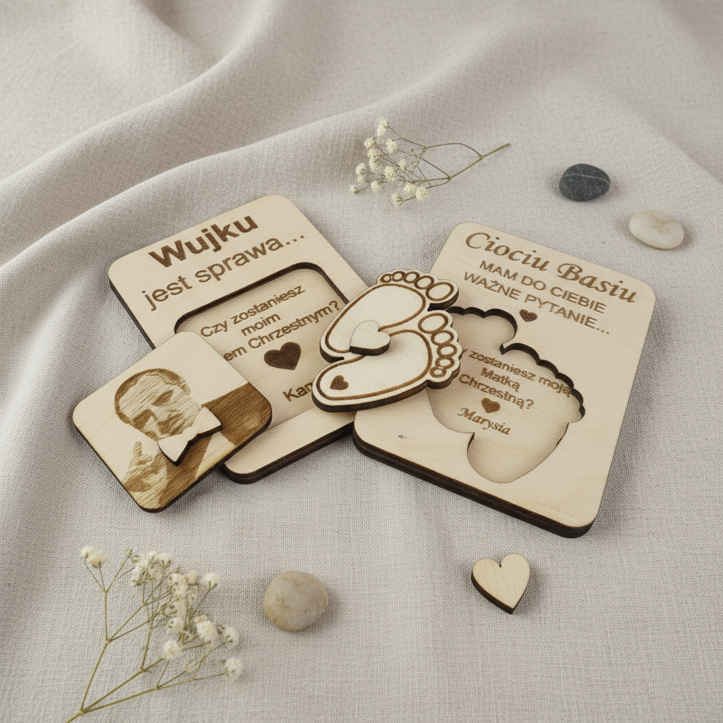 Prośba do Chrzestnych – komplet tabliczek drewnianych z kopertami